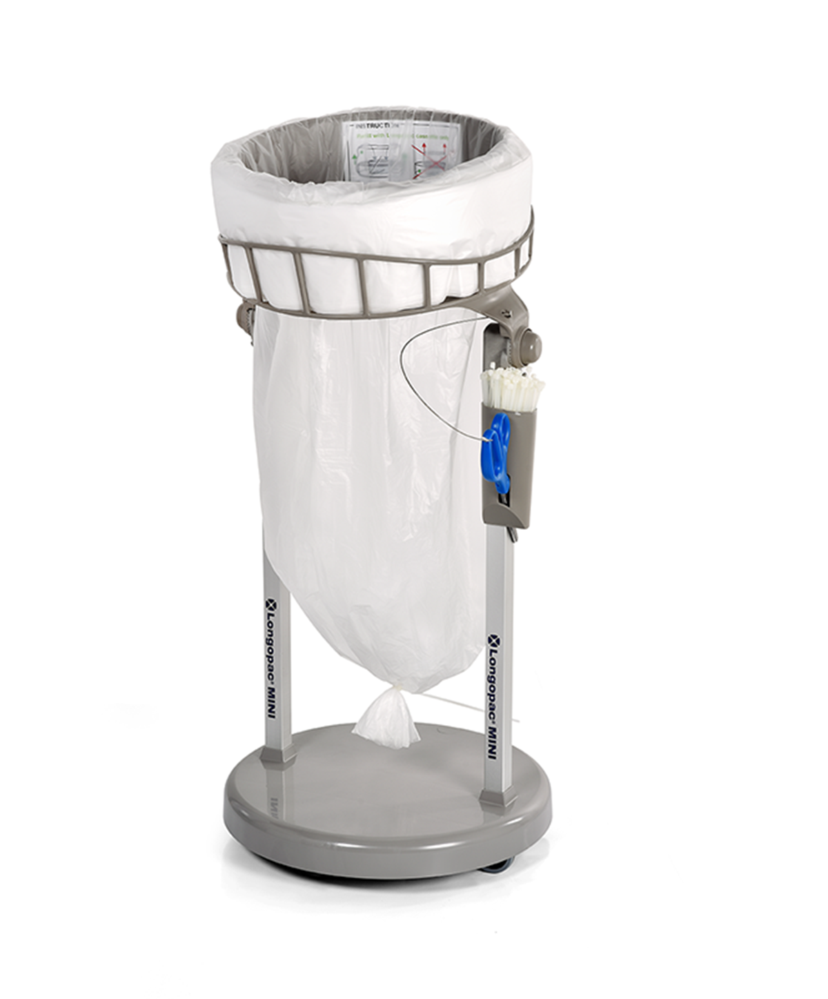 Ett golvställ för en mer hygienisk hantering då byte och förslutning sker från säckens utsida – ingen kontakt med avfallet. Mått H x B x D: 850 x 430 x 400 mm. Inkastöppning: Ø 305 mm. Laddas med säckkassett Longopac Mini.