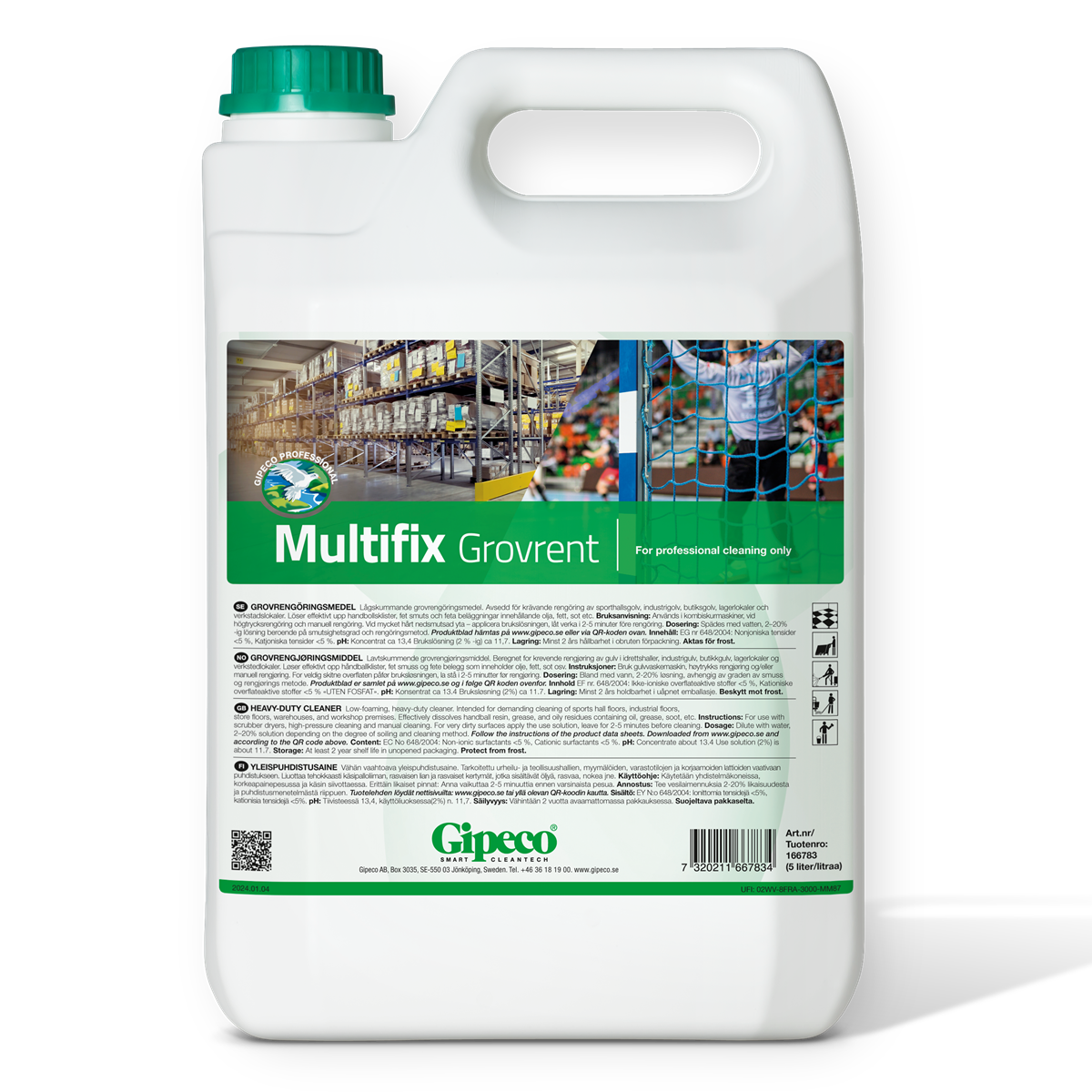 Högeffektivt lågskummande grovrengöringsmedel, tensidbaserat utan kolväten. Avsedd för krävande rengöring av sporthallsgolv, industrigolv, butiksgolv, lagerlokaler och verkstadslokaler. Har ett brett användningsområde och är speciellt utformat för att snabbt tränga igenom och effektivt lösa upp handbollsklister, fet smuts och feta beläggningar innehållande olja, sot, fett etc.