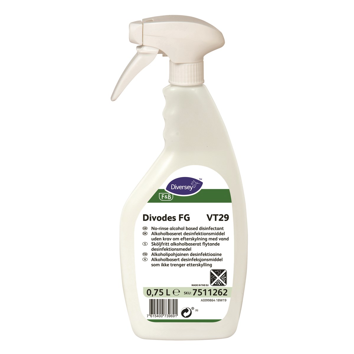 Divodes FG är säker att använda på ytor som kommer i kontakt med livsmedel och avdunstar snabbt utan att lämna rester. Den är lämplig för desinficering av alkoholtåliga ytor, maskiner och komponenter (transportband, fyllningsmaskiner, flaskinspektorer, vattenkänsliga komponenter etc.) samt föremål som skärbrädor, vilka ofta förekommer inom livsmedels- och dryckesindustrin. Den är också lämplig för desinficering av matdisplayer i exempelvis stormarknader och slakterier.