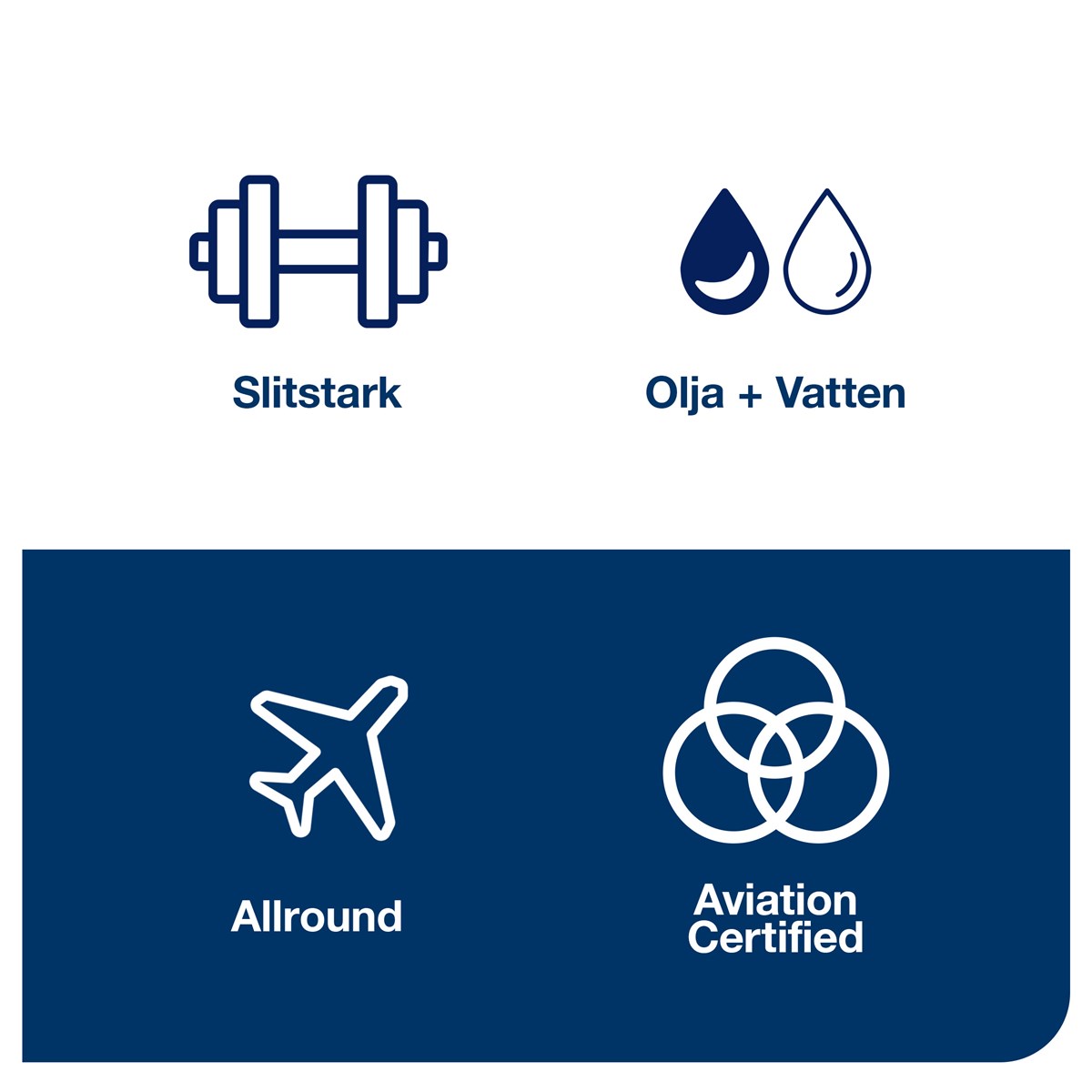 Utmanande uppgifter kräver en rengöringsduk som är slitstark och absorberande. Vår 1-lagers rengöringsduk kan användas med de flesta lösningsmedel för att snabbt ta hand om olja, fett och vätskespill. Rengöringsdukarna är extra stora och arken levereras kedjevikta för att underlätta städningen. De hjälper också till att göra din arbetsplats grönare eftersom exelCLEAN®-materialet kräver upp till 41 % mindre lösningsmedel än trasor, vilket gynnar både miljön och personalens hälsa. Effektiviteten förbättras också tack vare vår bärbara och lätta Tork Handy Box. 1-lagers. Premium-kvalitet. Vikt storlek: D 10.8 cm B 35.5 cm. Ovikt storlek: D 61.5 cm B 35.5 cm. Passar med W7 dispensrar.