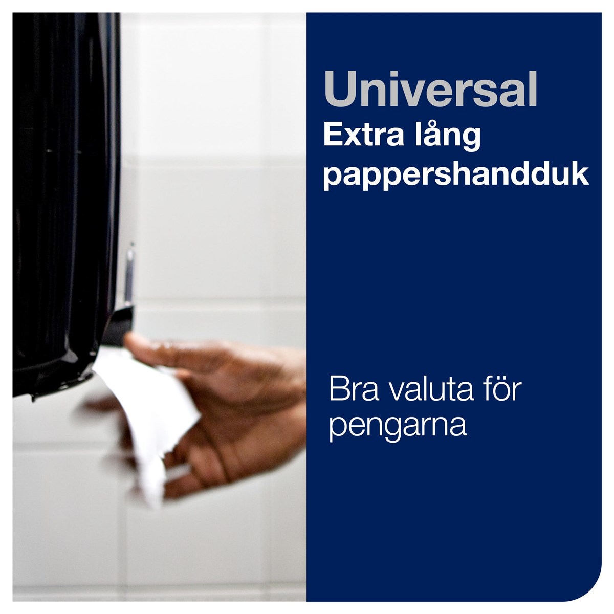 Pappershandduken passar utmärkt för handavtorkning och är idealisk för välbesökta toalettutrymmen som i skolor och på flygplatser. Pappershandduken i universal-kvalitet – erbjuder kvalitet till bästa pris och är en särskild ekonomisk lösning.6 rullar, 1-lagers. Universal-kvalitet. Mått: 280 m x 21 cm. Hylsa inre diameter: 3,8 cm. Passar med H1 dispensrar.