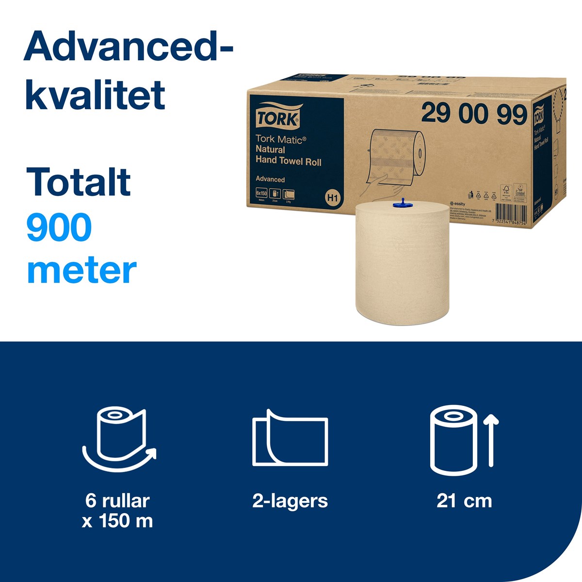 Tork Matic® Pappershandduk på rulle natur H1: Dessa pappershanddukar på rulle är ideala för välbesökta toalettutrymmen och skämmer bort dina gäster genom att låta dem torka händerna skonsamt och noggrant. Den ljusbruna färgen kommer från att återvunna kartonger, vilket är en av produktens fiberkällor. Inga färgämnen tillsätts vid tillverkningen. Pappershanddukarna kräver dessutom ett lågt underhåll. 6 rullar,/kartong. 2-lagers. Advanced-kvalitet. Storlek på rulle: D 150 m, B 21 cm. Hylsa inre diameter: 3.8 cm. Passar med H1 dispensrar.