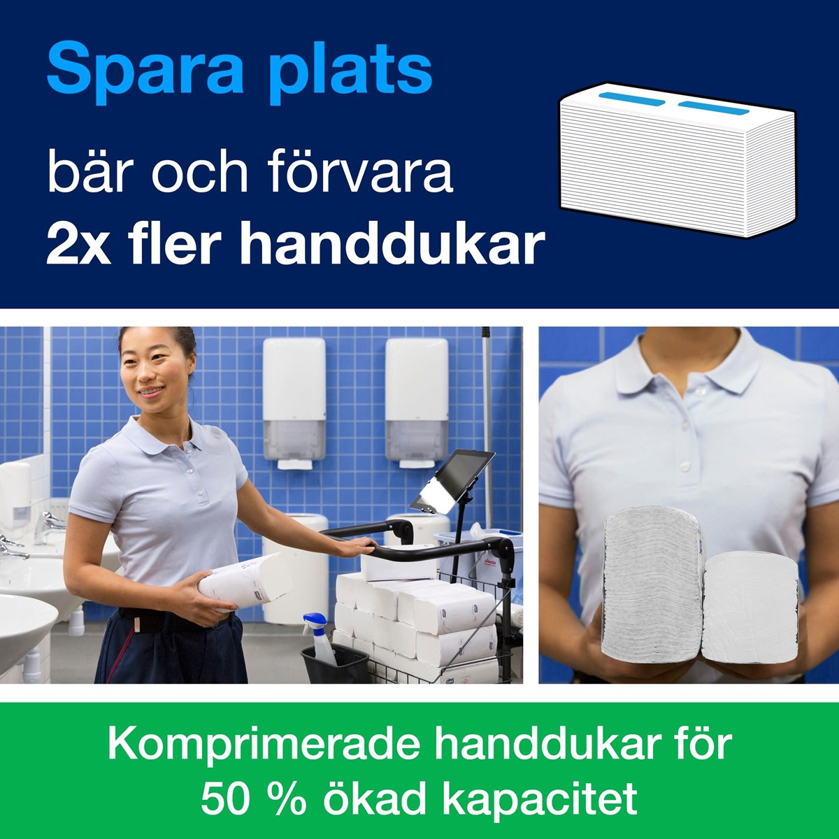 1-lags vita handdukar av baskvalitet (Universal). Buntarna är komprimerade med 50% så att det får plats dubbelt så många på mindre yta. Buntarna greppar in i varandra när de fylls på så att de fortsätter matas ut en i taget utan avbrott. Detta ger hög kapacitet och färre påfyllningar samt bättre genomflöde i toalettutrymmena. Det finns alltid en tillgänglig handduk som är lätt att ta tag i och dra ut. Mått: 22,5 x 20,1 cm. 410 st/bunt, 4920 st/förp. Passar till Tork hållare H5.