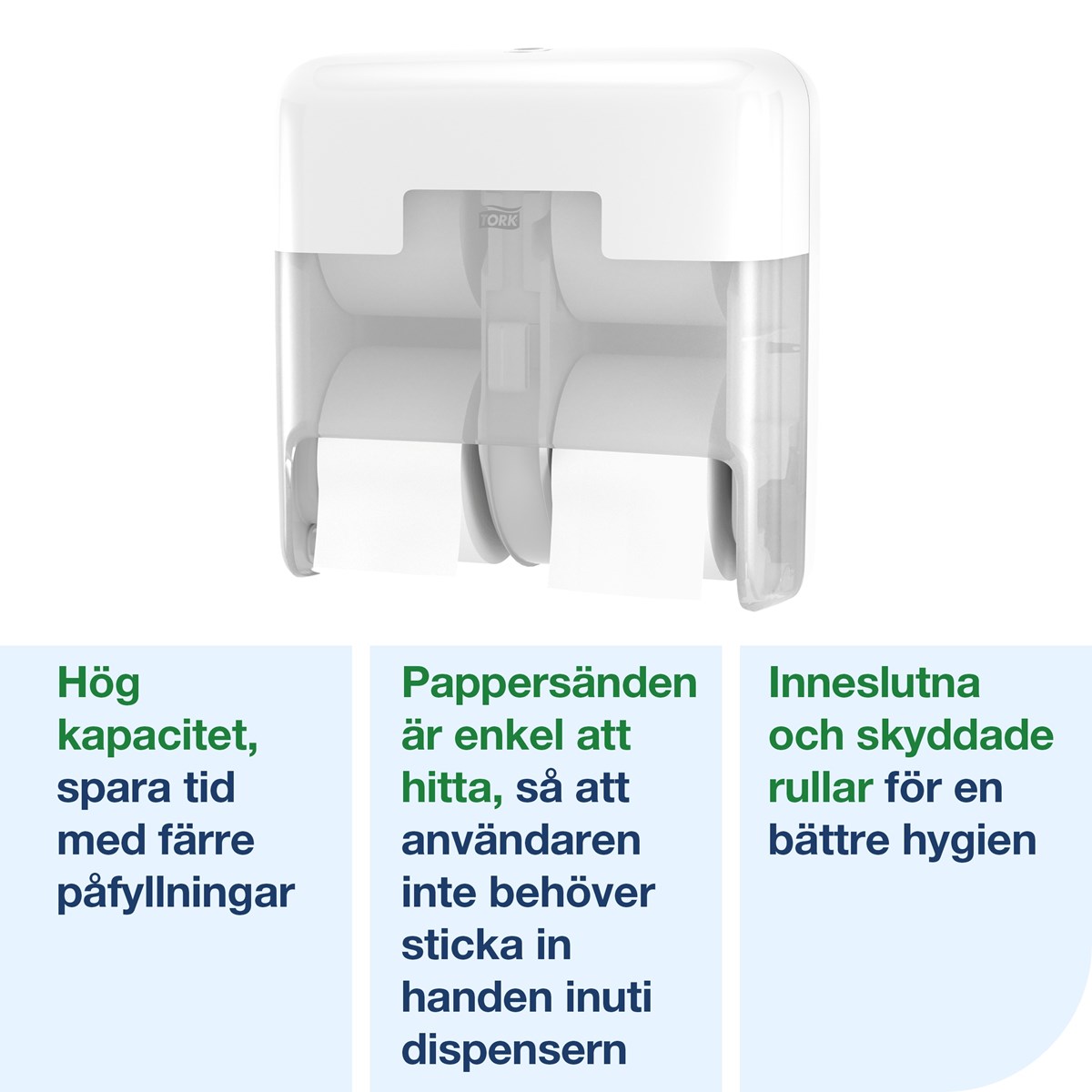 Tork OptiServe® Coreless är ett system med hög kapacitet för toalettpapper utan hylsa som passar anläggningar där effektivitet, hållbarhet och en utmärkt upplevelse är av största vikt. Hög kapacitet, minskad förvaringsplats och en design som är Easy to use-certifierad gör det till ett bättre alternativ än vanligt toalettpapper och jumborullar. Denna vertikala dispenser för fyra rullar toalettpapper är del av ett brett sortiment som möter behoven i olika toalettutrymmen, så att samma kompakta refiller för toalettpapper kan användas i hela anläggningen. Jämfört med vanligt toalettpapper rymmer Tork OptiServe® Coreless rullar 3 gånger mer papper eftersom de varken har hylsa eller omslag, vilket innebär mindre avfall.