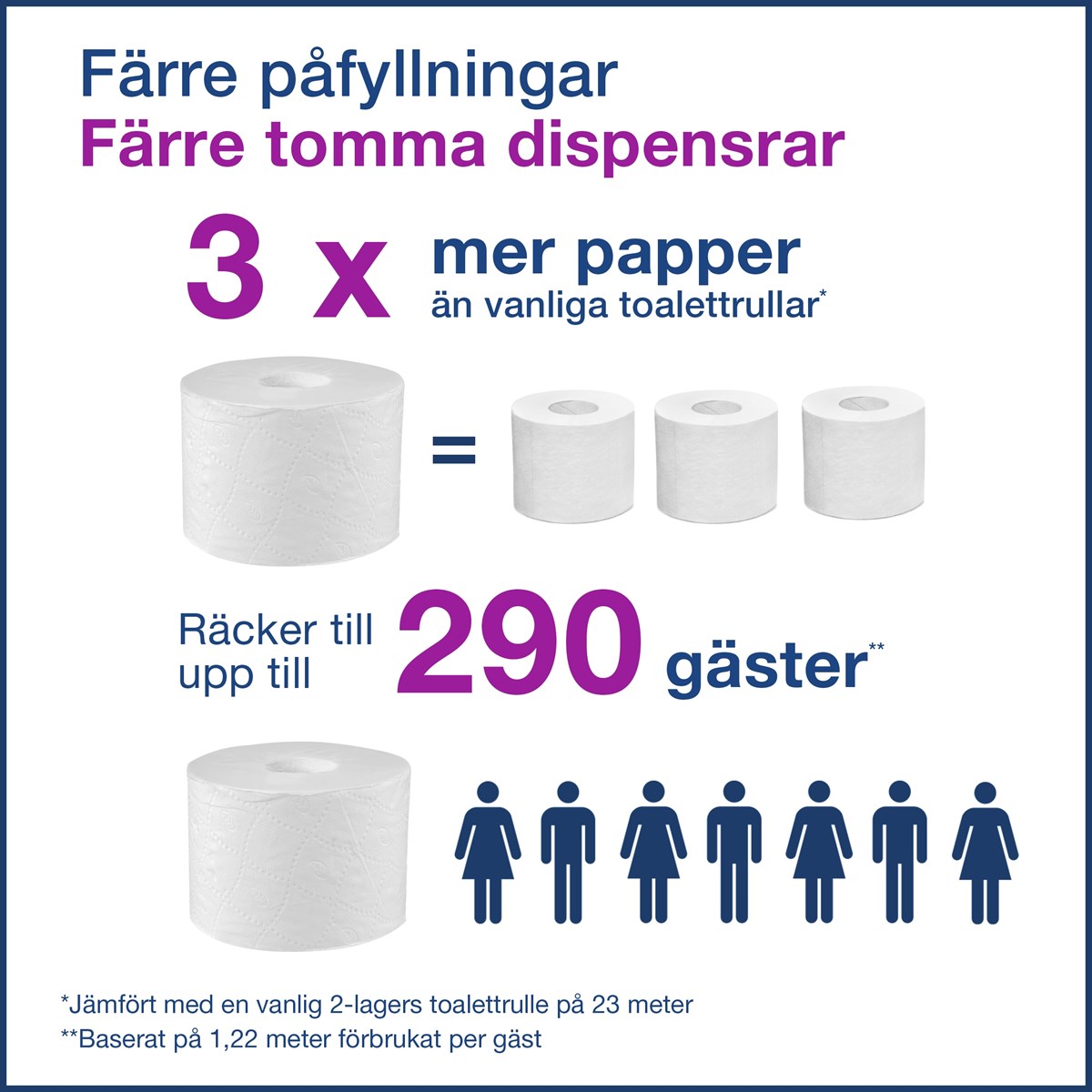 - Prisvärt 1-lagers toalettpapper som ger valuta för pengarna - Undvik att pappret tar slut med 3 gånger mer papper än vanliga rullar - Kompakta toalettrullar – spara tid med färre påfyllningar - Varken hylsa eller omslag innebär mindre avfall - Tar upp hälften så mycket förvaringsplats som vanliga toalettrullar - Tork Easy Handling® förpackning för ergonomisk hantering