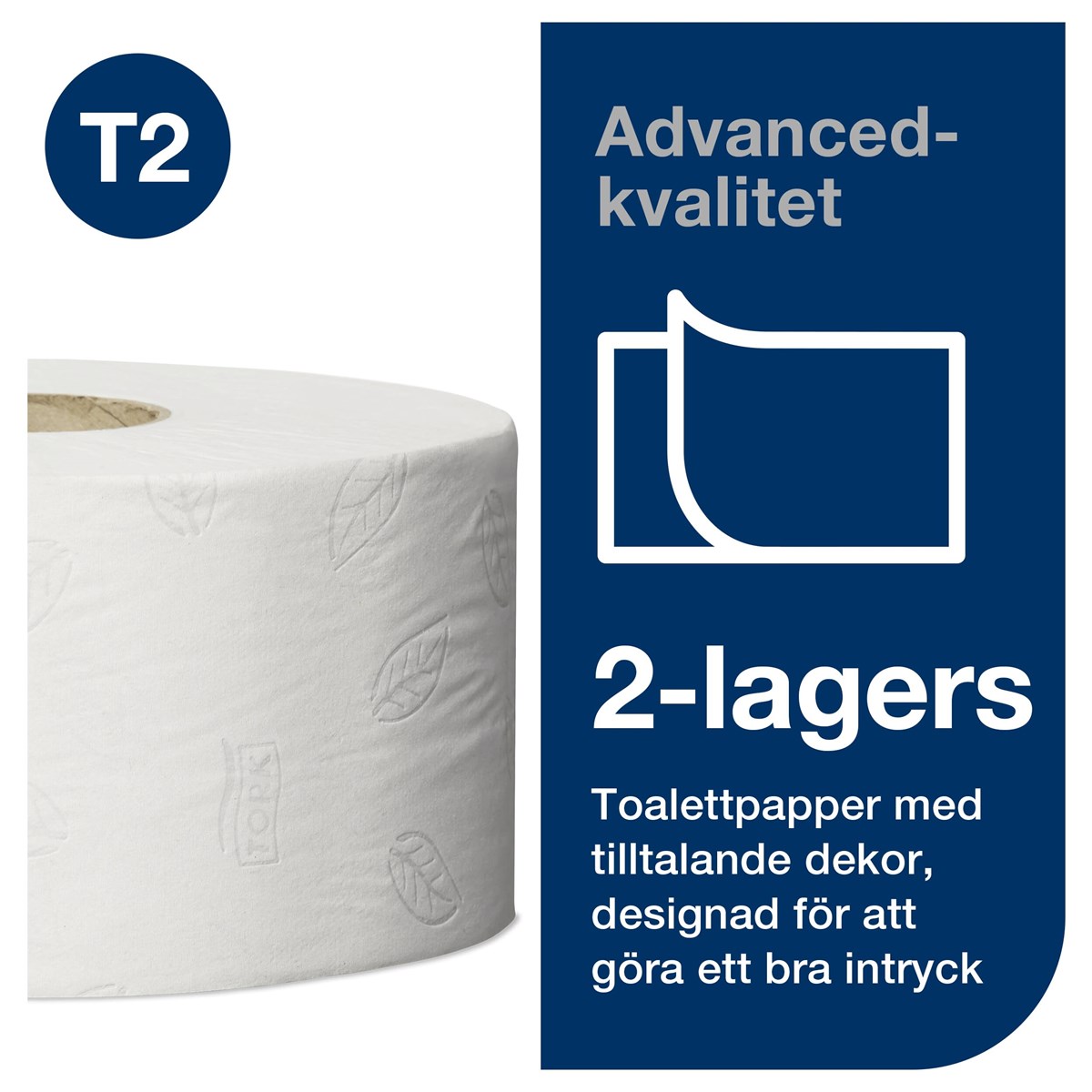 Vitt, 2-lags toalettpapper av god kvalitet (Advanced). Dekorprägling i grått. Perforerat. 170 m/rulle. 12 rl/förp.