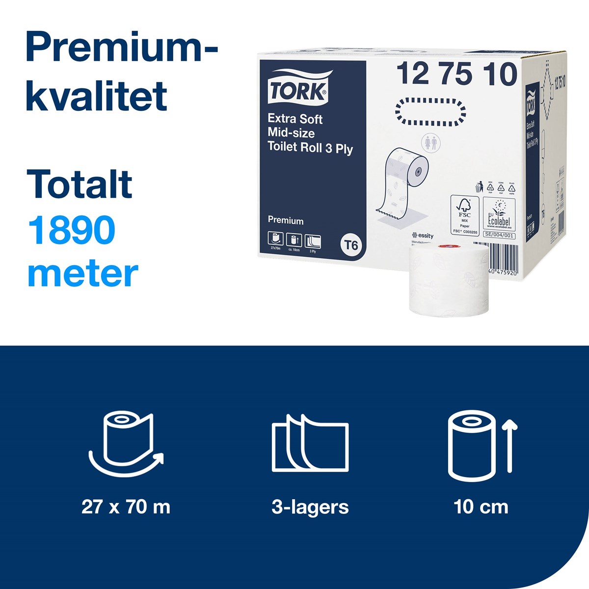 Kompakta Mid-size-rullar: en rulle motsvarar 4-5 vanliga toalettpappersrullar Lyxigt, extra mjukt och ljust papper som ger ett bestående intryck Snygg dekor: utformad för att skapa ett gott intryck